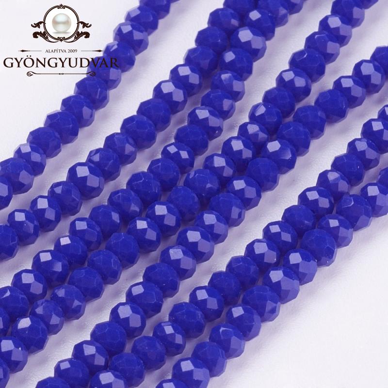 3 x 2 mm-es donut (ovális keresztben fúrt) telt sötétkék színû csiszolt üveggyöngy. A csomag egy kb. 40 cm-es szálat, kb. 135 db gyöngyöt tartalmaz. Egységár: ~4.-/db