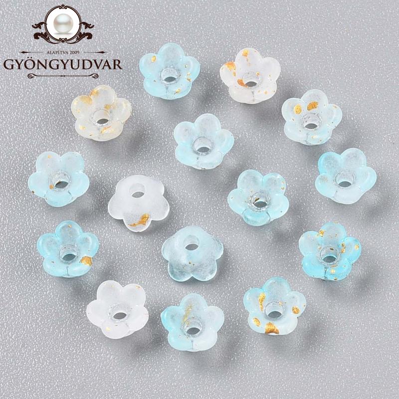 6 x 3 mm-es virág alakú akril gyöngy. Az ár 20 db virágra vonatkozik. Egységár: 8.-/db.