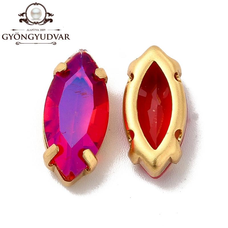 Üveg csiszolt navette arany színű réz foglalattal. Mérete 15 x 7 x 4 mm. Az ár 1 db-ra vonatkozik.