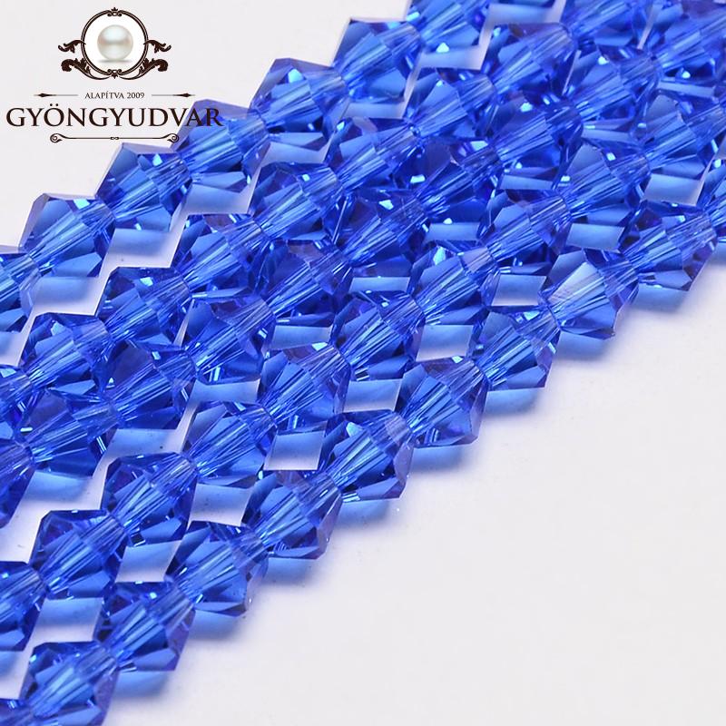 4 mm-es csiszolt kúpos üveggyöngy (bicone). A csomag 20 db gyöngyöt tartalmaz. Egységár: 12.-/db.